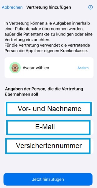 Nachdem die Karte erfolgreich gelesen wurde, ist es nun erforderlich, die Daten (Name, Versicherungsnummer und E-Mail-Adresse) von Ihnen als Vertreter einzugeben, um den Zugriff und die Vertretung erfolgreich abzuschließen. Unter „Vertretende Person hinzufügen“ folgt die Eingabemaske.