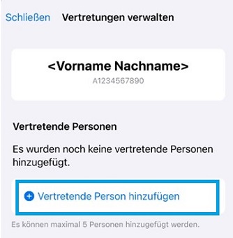 Klicken Sie auf „Hinzufügen“ unter dem Punkt „Personen, die Sie vertreten“ aus, um die gewünschte Vertretung hinzuzufügen.