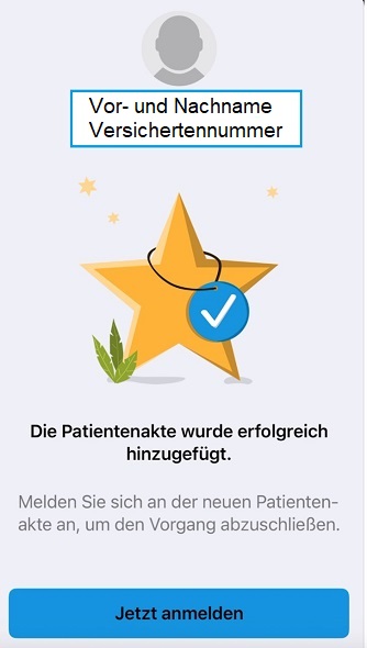 Sie werden gebeten, sich an der neuen Patientenakte anzumelden, um den Vorgang abzuschließen. Klicken Sie daher bitte auf „Jetzt anmelden“.