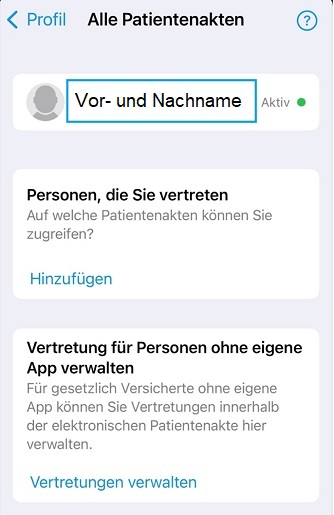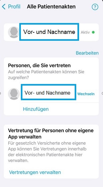 Hinweis: sind bereits Vertretungen eingerichtet, dann lautet das Textfeld: „Ihre Patientenakte – Alle Patientenakten“